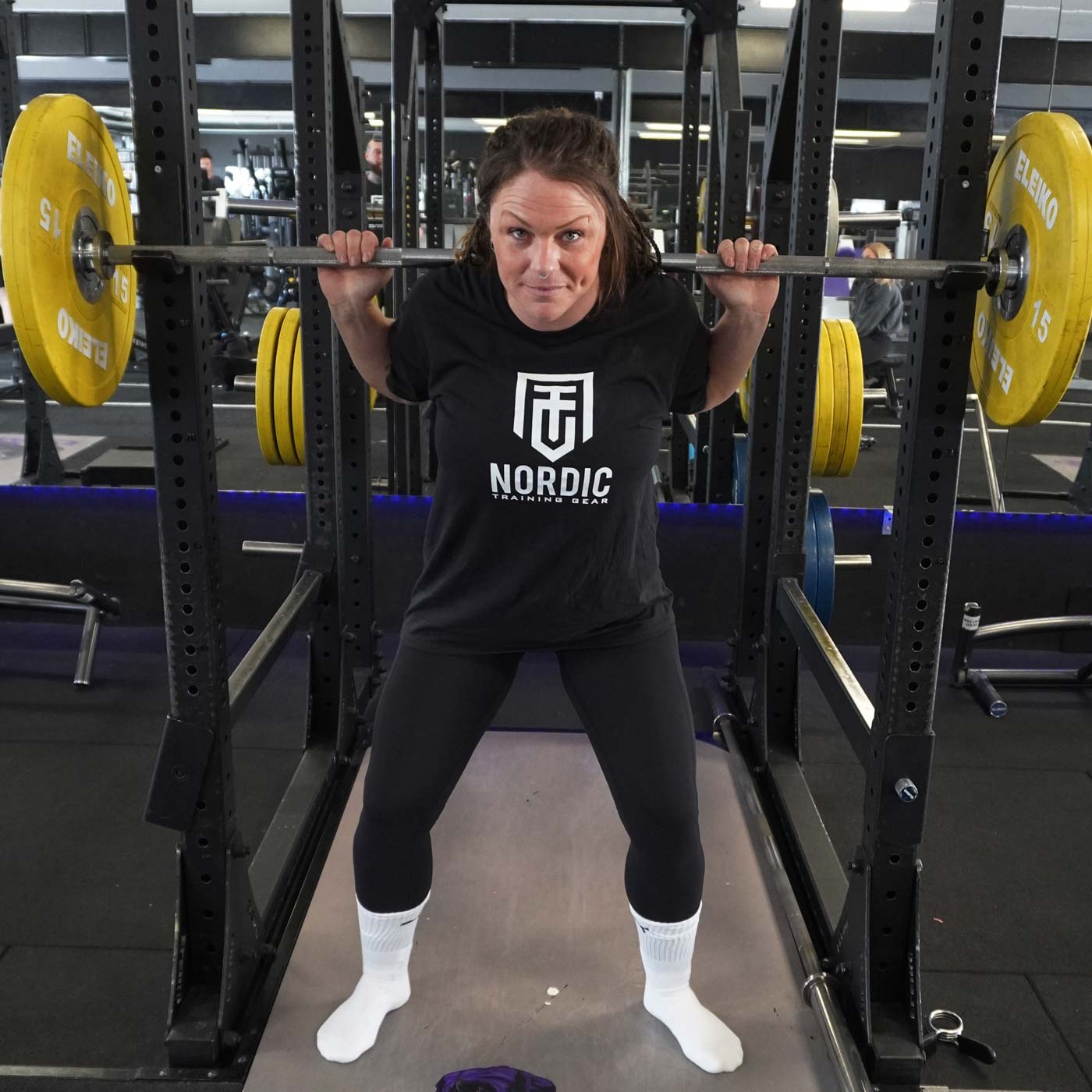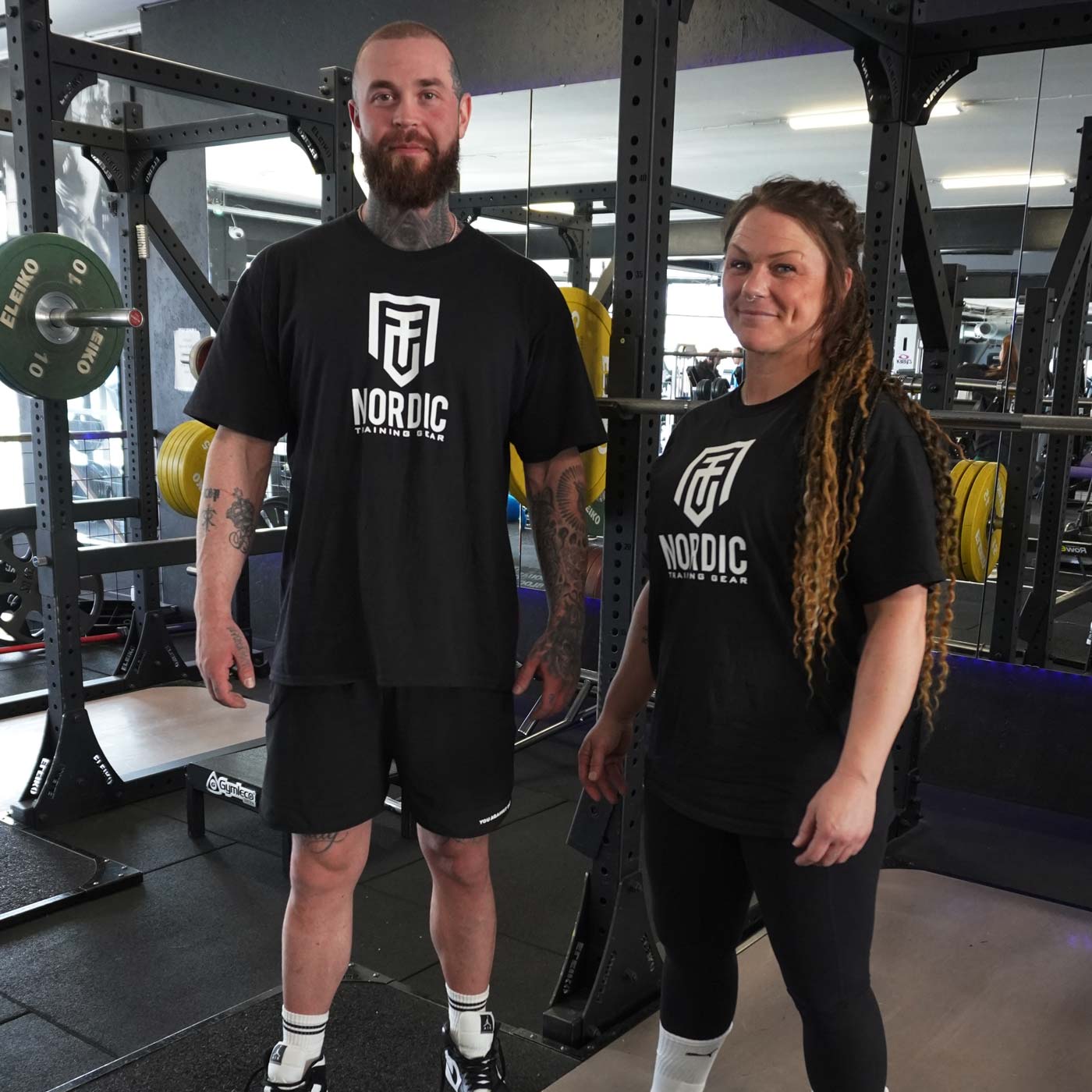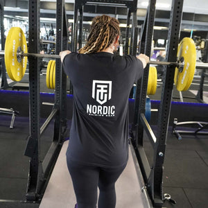 A more durable and heavier black t-shirt with a stylish Nordic Training Gear print on both the front and back. The t-shirt has a modern fit with a rib knit collar. The label at the neck can be torn off/cut off for good comfort. Fits just as well at the gym as at the party.